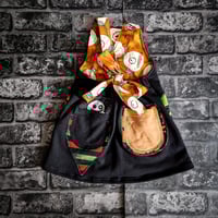 Pockets to the front and back and adjustable straps that tie at the back.